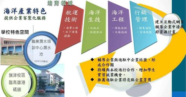 發展海洋文化,以水產品(食品、養殖)、海洋運輸、海事工程的科學為主,導入B型企業思維,提升企業存在價值,除了帶動經濟成長外,還能維護社會公益。本校提供: 1.新產品研發,儀器設備和新技術,操作空間的顧問諮詢和教育培訓等。2.協助企業和教育機構的合作,以改變業務種類,促進競爭力。3.提供技術轉移,讓學術研究成果商業化。