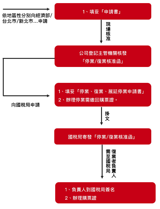 - 公司暫停營業1個月以上者,應於停止營業前或停止營業之日起15日內申請停業登記,並於復業前或復業後15日內申請復業登記。